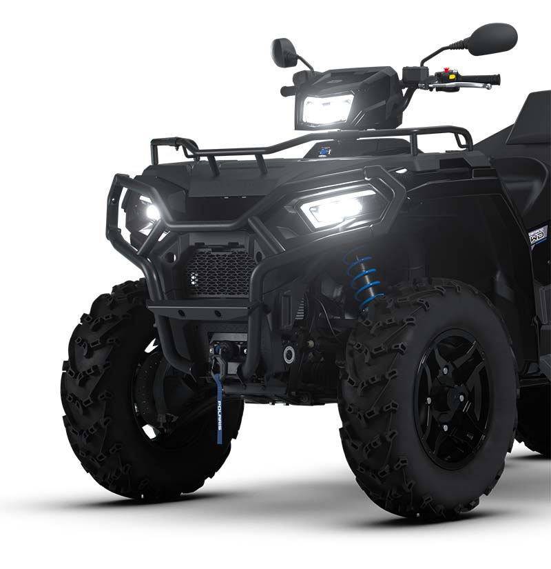3 modos de condução: Standard / work / performance. Tomada de 12 V, porta de carregamento lento no painel, aquecedores de mãos e polegares incluídos, sistema de segurança ativado por PIN (P.A.S.S.). Guincho de 3500 lb com corda sintética e NOVO Auto Stop. Proteções dos braços em A dianteiros e traseiros, para-choques dianteiro trail, extensor de rack dianteiro, grades metálicas da caixa de carga, plásticos pintados, protetores de mãos.